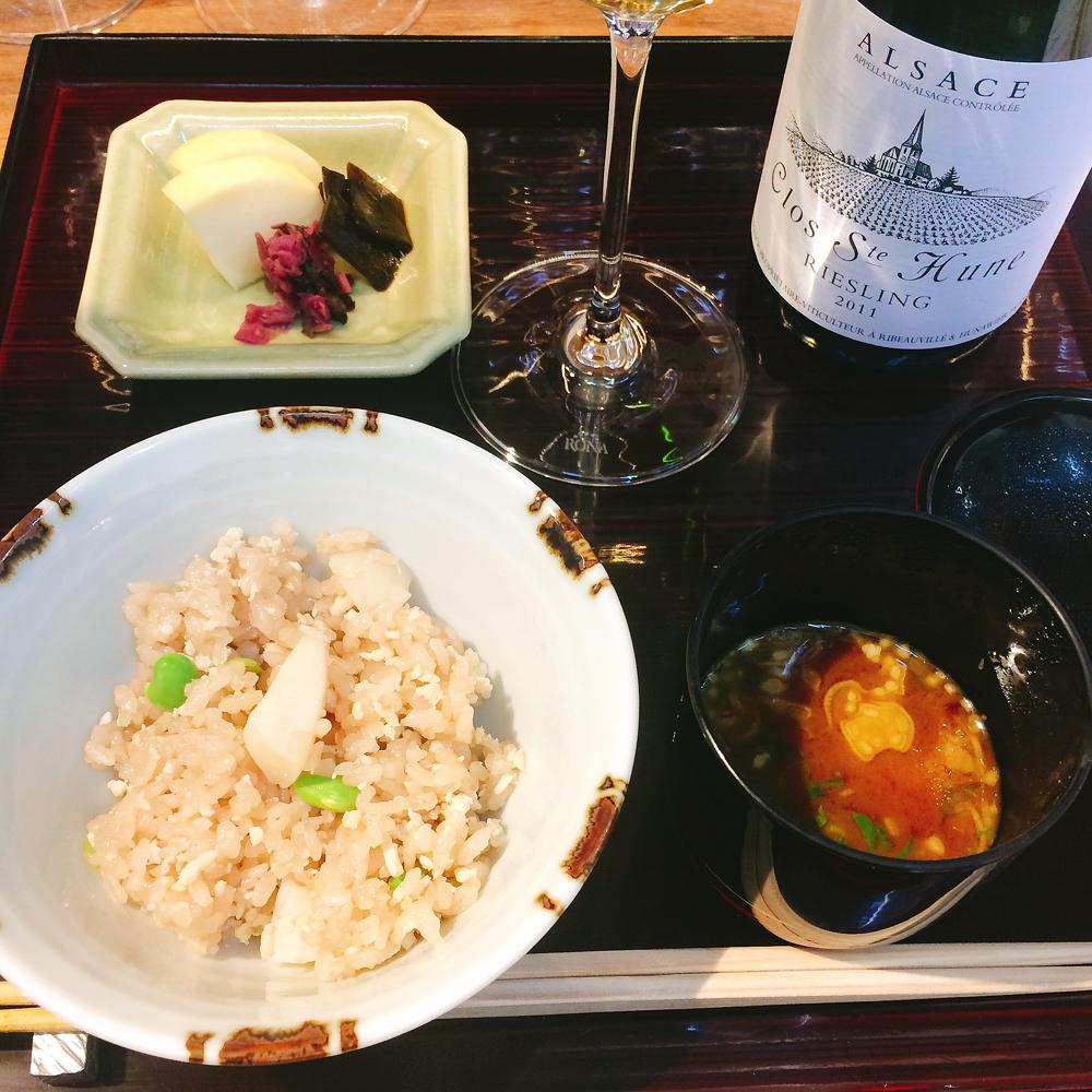 アルザスの辛口白ワインの最高峰で、生産量が毎年約8,000本と極端に少なく、世界中で取り合いになるワイン。熊本天草の車海老は当然美味しく、ぴりっと効いた山椒がワインの旨味を助長し、添えられたシナモンを少し振ると、あら不思議。ワインの味わいが滑らかに感じるようになり、車海老との距離が急激に縮まった印象。カレー塩も同じ様な効果があり、ワインとのつなぎ役を誰に任せるかでペアリングの成否が決まるのだろう。味醂の甘さがほんのり感じられる炊き込みご飯は、何のワインを合わせても良いと言われたが、やはり極上の旨味を備えたクロ・サン・テューヌにして正解だった。