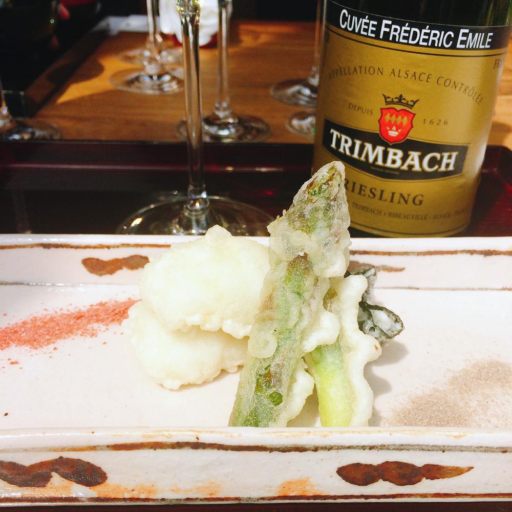 鱧天麩羅 アスパラ 大和芋海苔包み 藻塩