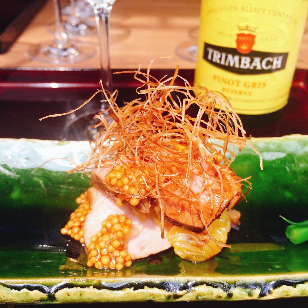 ジャン・トリンバック氏が長年のペアリング経験から導いた結論”和食にはピノ・グリ”。3日前の銀座のお鮨屋さんでの会食でピノ・グリを持ち込み、鯛の昆布〆、車海老、穴子の握りと最高のマリアージュを体験したので、ジャン氏の理論に心底同感。今回はアルザスでもポピュラーな鴨肉との組み合わせ。赤身肉のクセにも負けず、皮に近い脂身がワインの旨味と合い、たっぷり添えられた粒マスタードの適度な酸味とも素敵に融合する。同席したワインジャーナリストの安齋さんは、”肉好きだけど赤ワイン嫌い”の方にオススメと仰られ一同納得。