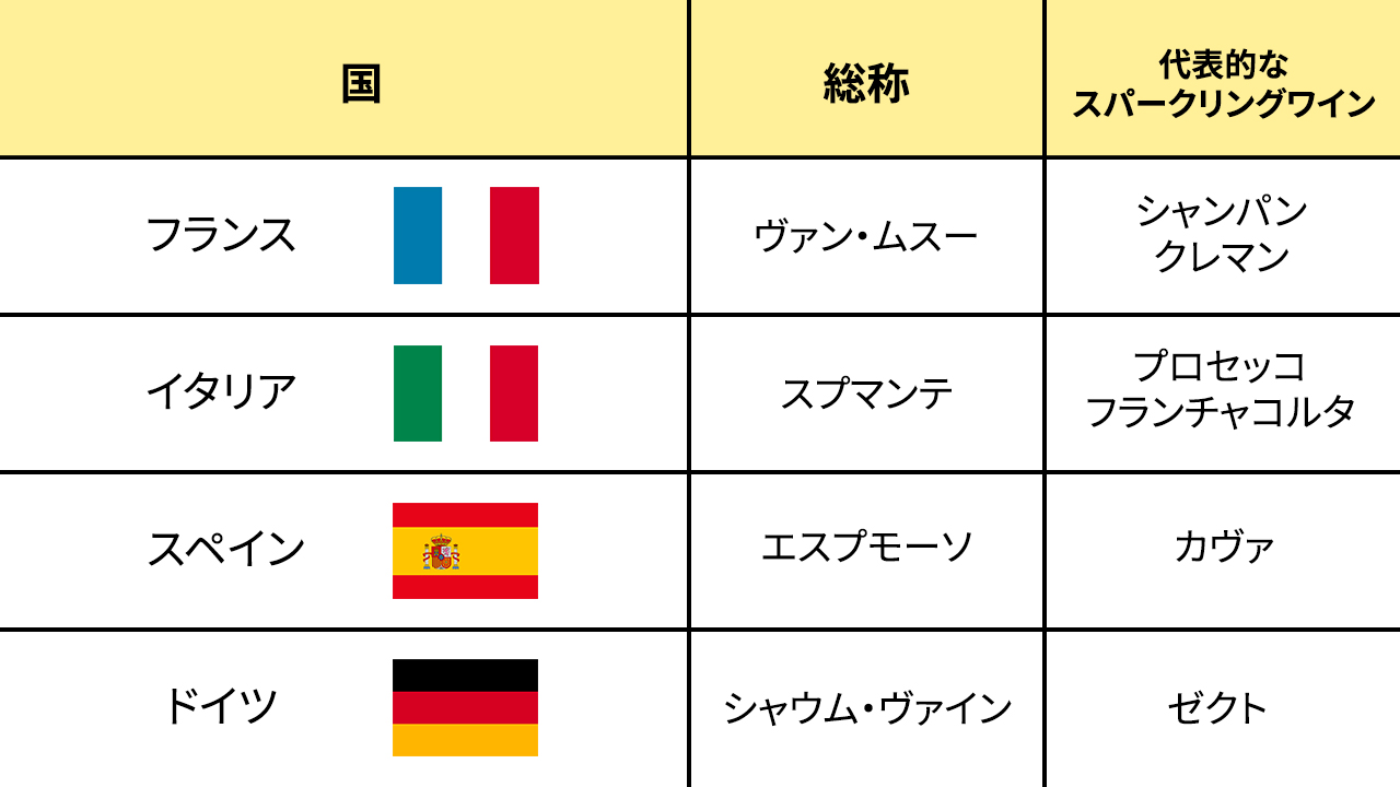 フランスではヴァン・ムスー、イタリアではスプマンテ、スペインではエスプモーソ、ドイツではシャウム・ヴァイン。これらも「スパークリングワイン」との違いがややこしくなりがちなワイン用語ですが、各国のスパークリングワインの総称です。