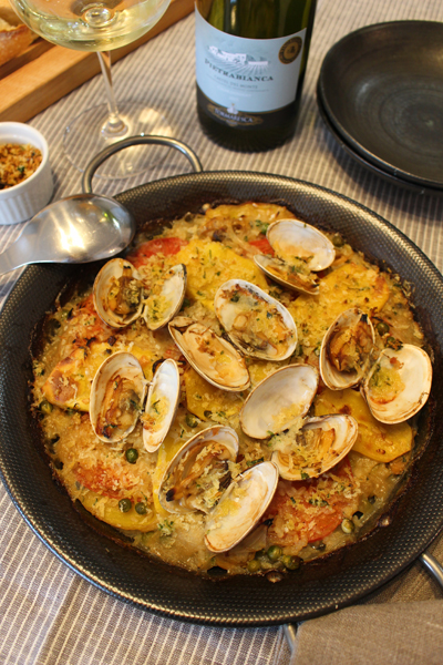 旬を迎えた大振りのあさりは、身もスープも残さず味わえるメニューで頂きたいところ。本日は、南イタリア、プーリア州の郷土料理のひとつ「ティエッラ」で決まりです♪