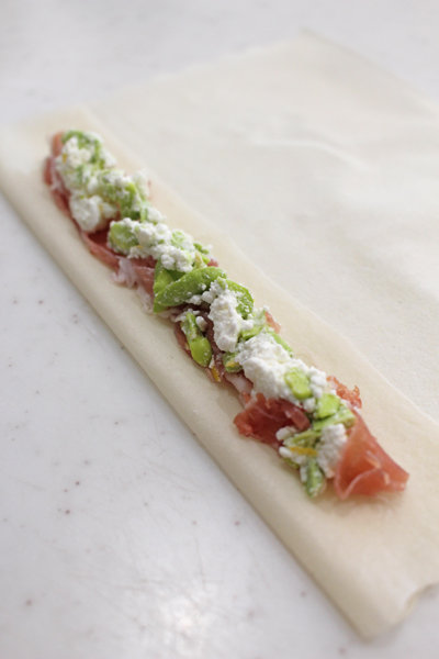 春巻きの皮は1枚の下1/3程を折っておき、その上に生ハム、フィリングを細長く置いたら左右と上端に水をつけて巻き込み、最後に指できゅっと左右の皮を押してくっつければ完成です。