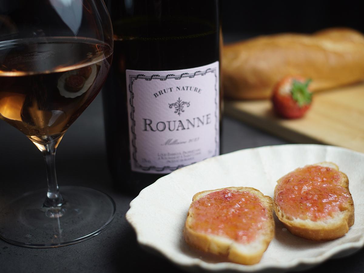 すりおろしたイチゴの酸味に、オリーブオイルのほのかな苦味が重なり、奥行きのある味わいに仕上げました。 「ルーアンヌ・ブリュット・ナチュール・ロゼ」は非常にドライなスパークリングワインのため、甘みを加えず、イチゴとオリーブオイルの風味をダイレクトに楽しむスタイルがよく合います。 にんにくをこすりつけたバゲットの香ばしさに、粗塩の食感、イチゴの酸味とオリーブオイルのコクとほのかな苦味。シンプルな素材だからこそ、それぞれの個性が引き立ち、ワインとの調和が生まれます。 おいしく仕上げるポイントは、素材選び。イチゴは見切り品でも問題ありませんが、オリーブオイルと粗塩はちょっと良いものを使うのがおすすめです。