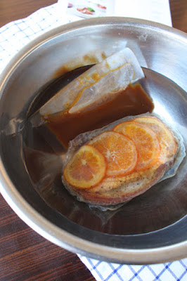 ご指示通りに実践です!まずは、パッキングされたお肉とソースを60℃のお湯に10分漬けて温めることからスタートします。