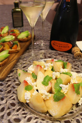 桃が美味しい季節に必ず作る前菜。娘も大好きな一皿なので、量もたっぷりと!ジューシーな桃とリコッタやモッツァレラなどのフレッシュチーズ、そしてハーブのミントは黄金コンビ。桃は、事前にレモン果汁とホワイトバルサミコ酢でほんのりマリネしておきます。これがもう、スパークリングワインが止まらなくなると言っても過言ではない一皿なのです♪♪(最初からこれでは、ワインが何本あっても足りませんが。笑)
