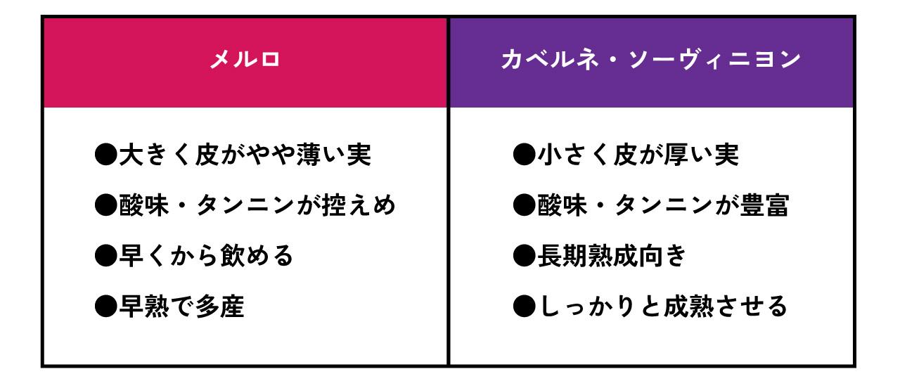 カベルネ・ソーヴィニヨンとメルロは、どちらもフランスのボルドー原産品種で、似た要素がありながらも、それぞれが際立った個性を持っています。 どちらもブルーベリーやカシスのような果実の風味が感じられ、カベルネ・ソーヴィニヨンは森の針葉樹やシダのような香り、メルロはキノコや土のような香りを感じやすく、味わいにおいては、カベルネ・ソーヴィニヨンがしっかりとした渋みを感じるのに対して、メルロは中程度の渋みで、よりやわらかさを感じます。 この二つの品種は個性を補い合うという意味でもブレンドに向いていて、どちらかの品種を主役にしながら、一方を補助品種としてブレンドするスタイルも主流です。