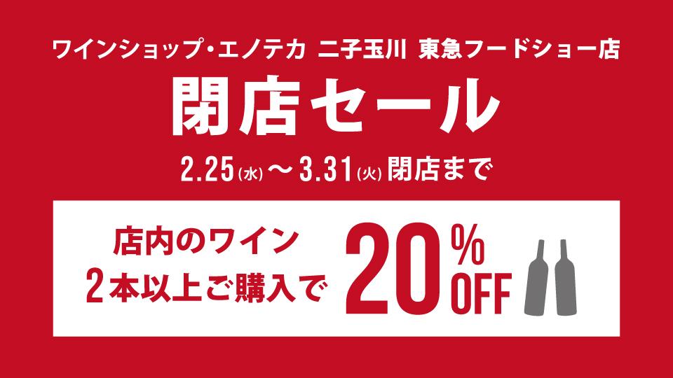 いつもエノテカをご利用いただき、誠にありがとうございます。誠に勝手ながらワインショップ・エノテカ 二子玉川 東急フードショー店は2026年3月31日(火)をもちまして閉店することとなりました。これまでご愛顧いただきましたお客さまに、心より御礼申しあげます。閉店に伴い、日頃の感謝の気持ちを込めて下記の通り閉店SALEを開催いたします。