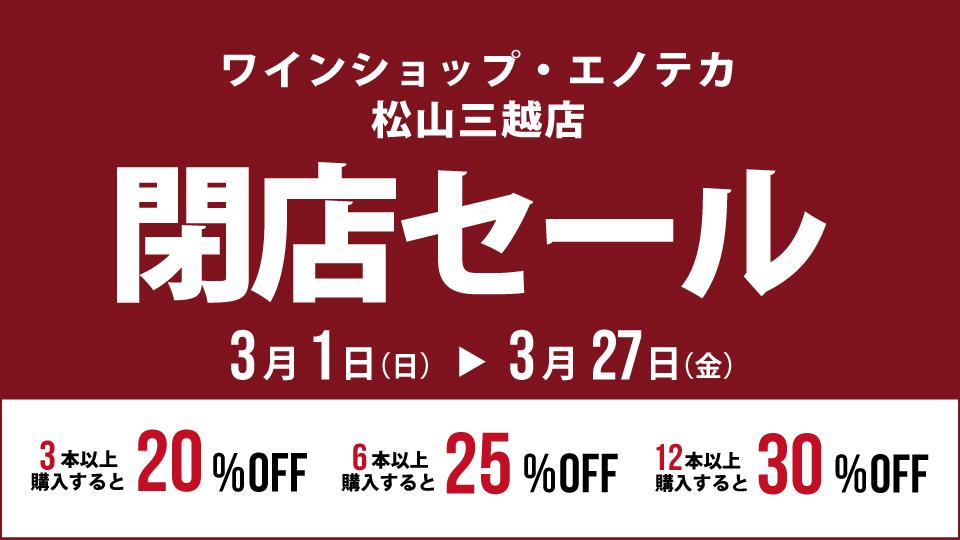 いつもエノテカをご利用いただき、誠にありがとうございます。誠に勝手ながらワインショップ・エノテカ松山三越店は2026年3月27日(金)をもちまして閉店することとなりました。これまでご愛顧いただきましたお客さまに、心より御礼申しあげます。閉店に伴い、日頃の感謝の気持ちを込めて下記の通り閉店SALEを開催いたします。