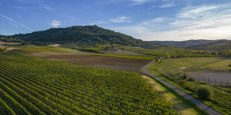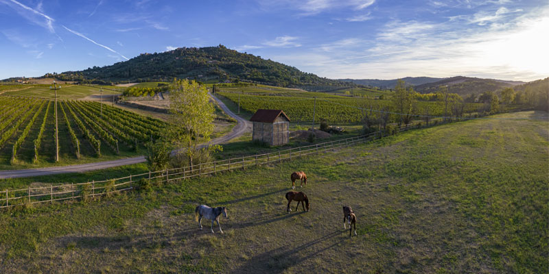 ワイナリーが位置するヴァル・ディ・カヴァ地区はモンタルチーノ村の北にあり、冷涼で昼夜の寒暖差が激しく、優美で酸のしっかりしたワインが生まれることが特徴。所有する畑の標高は230~250mで、土壌は砂、粘土、ガレストロが混ざった貧しいもの。樹勢が弱いため、自然に3~4t/haの低収量となります。