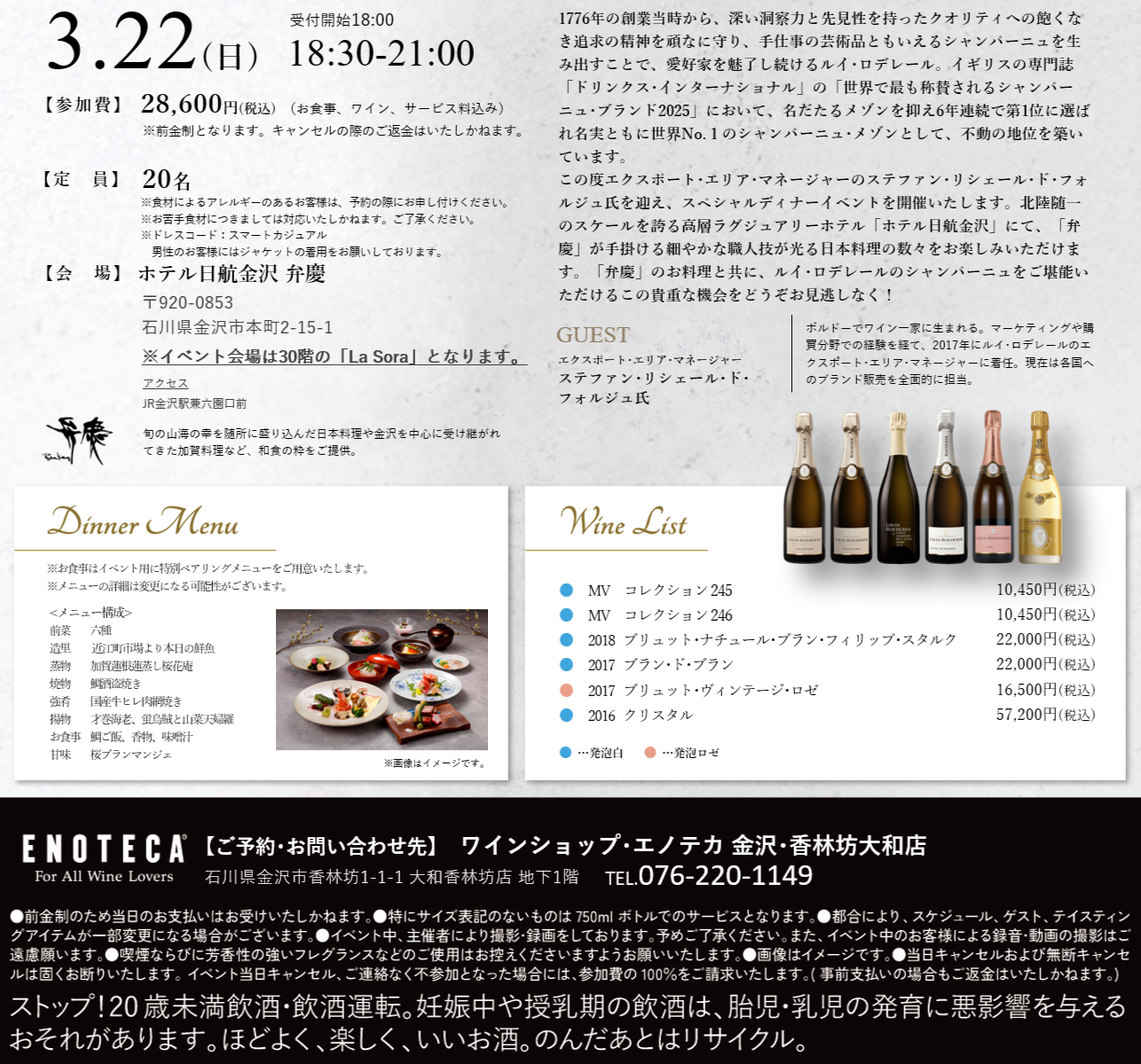 【参加費】28,600円(税込)(お食事、ワイン、サービス料込み)