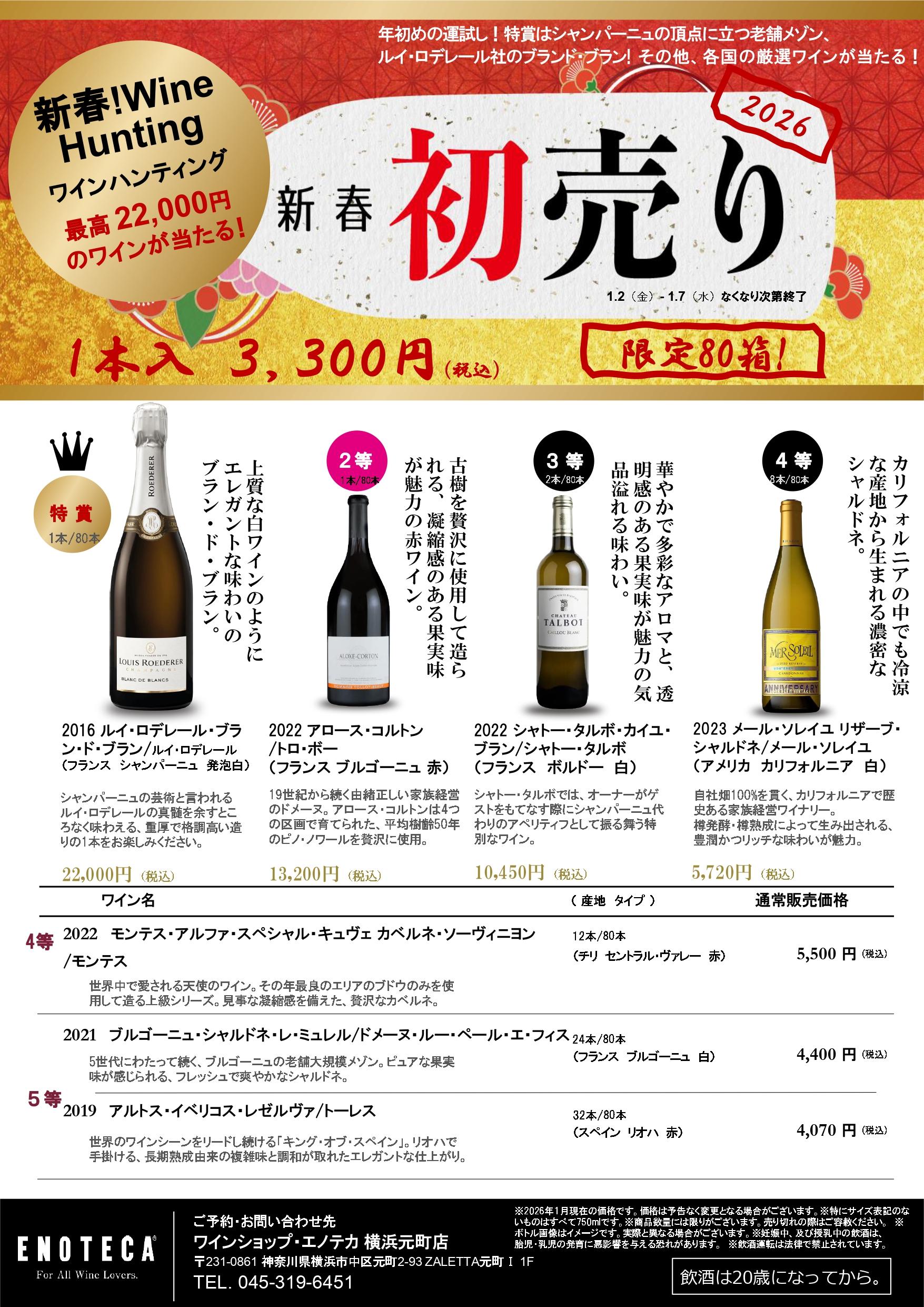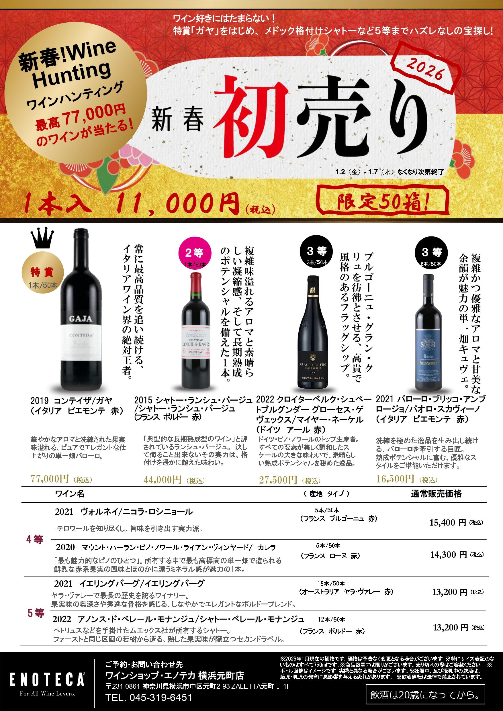 毎年恒例の金額以上のワインが当たる福箱に、中身が見える福袋、おみくじテイスティングなどなど…